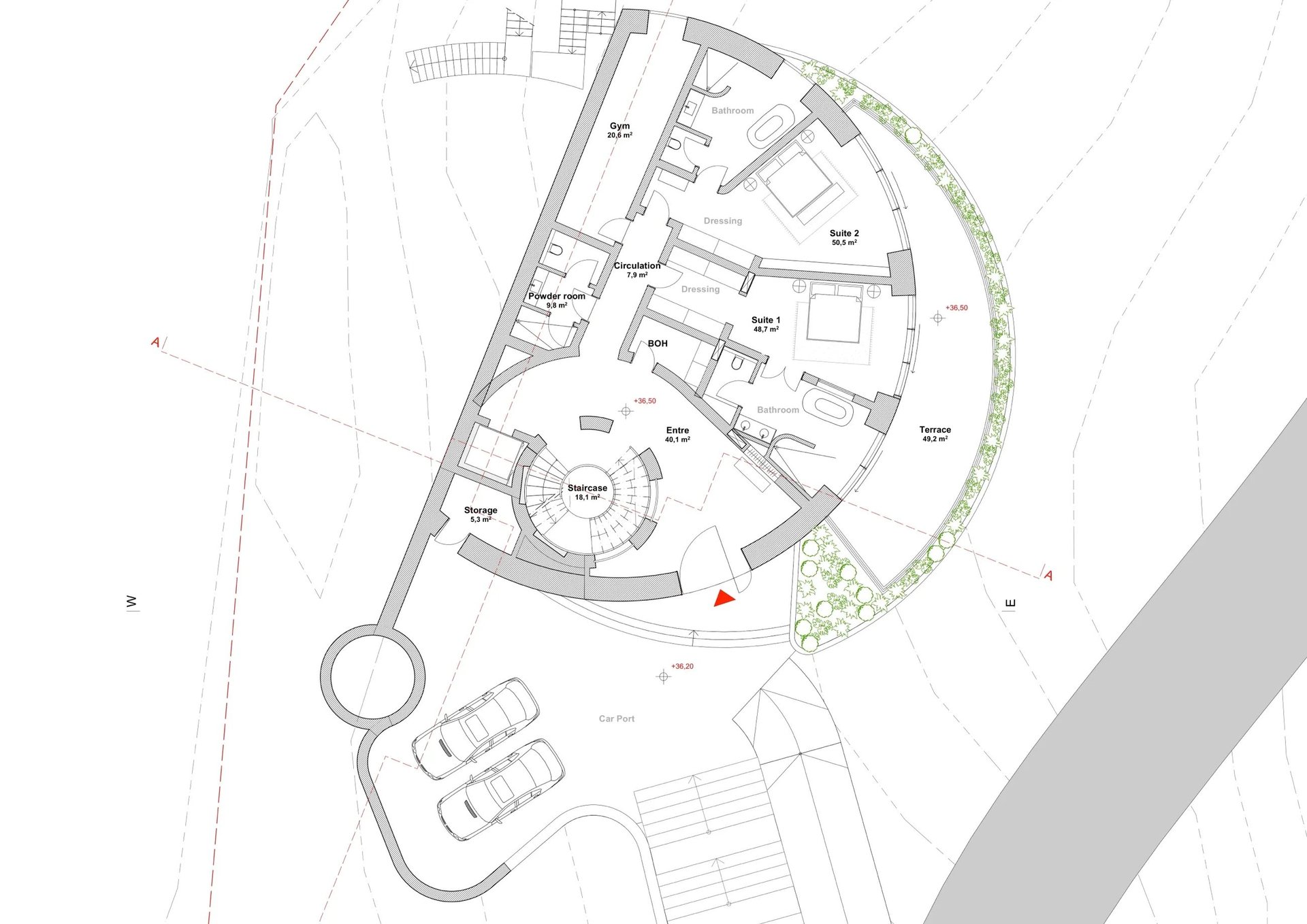 Level 2 introduces the villa’s arrival point, marked by an understated entrance and private car park. Two serene suites, a gym, and supporting spaces like storage and powder rooms are anchored by a shaded terrace. Each detail is curated for restorative living, with open circulation areas enhancing spatial fluidity and privacy.