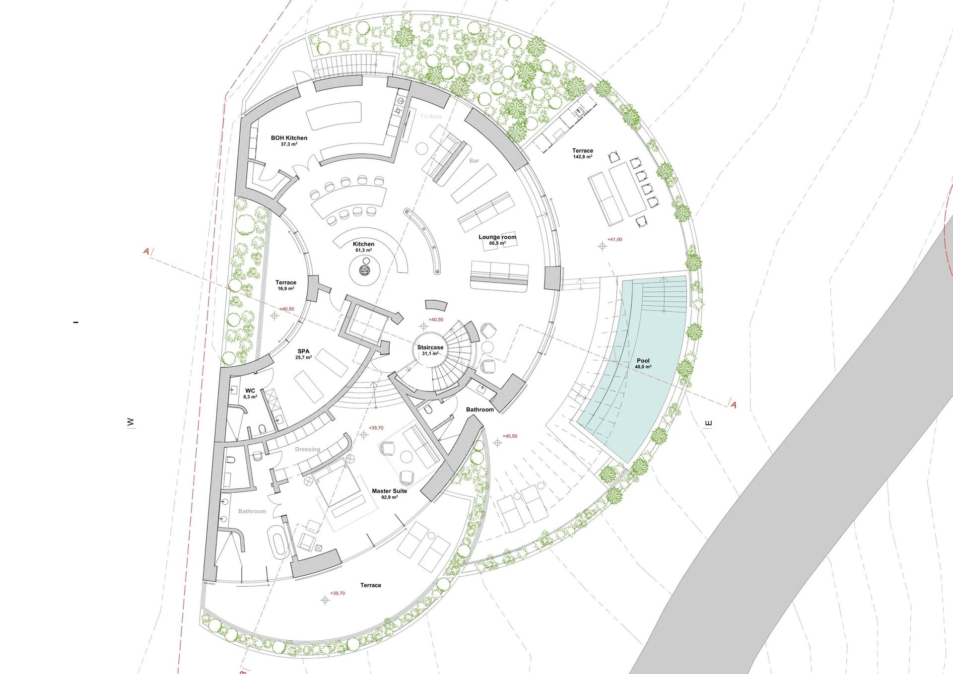 Crowning the villa, Level 3 reveals a dramatic shift in scale and indulgence. A voluminous master suite commands sweeping views, accompanied by a private spa, open-plan kitchen (61.3 sqm), and lounge room. The layout unfolds onto generous terraces, including a sun deck, complemented by a private pool, bar area, and a seamless indoor-outdoor rhythm that epitomizes tropical modernism.