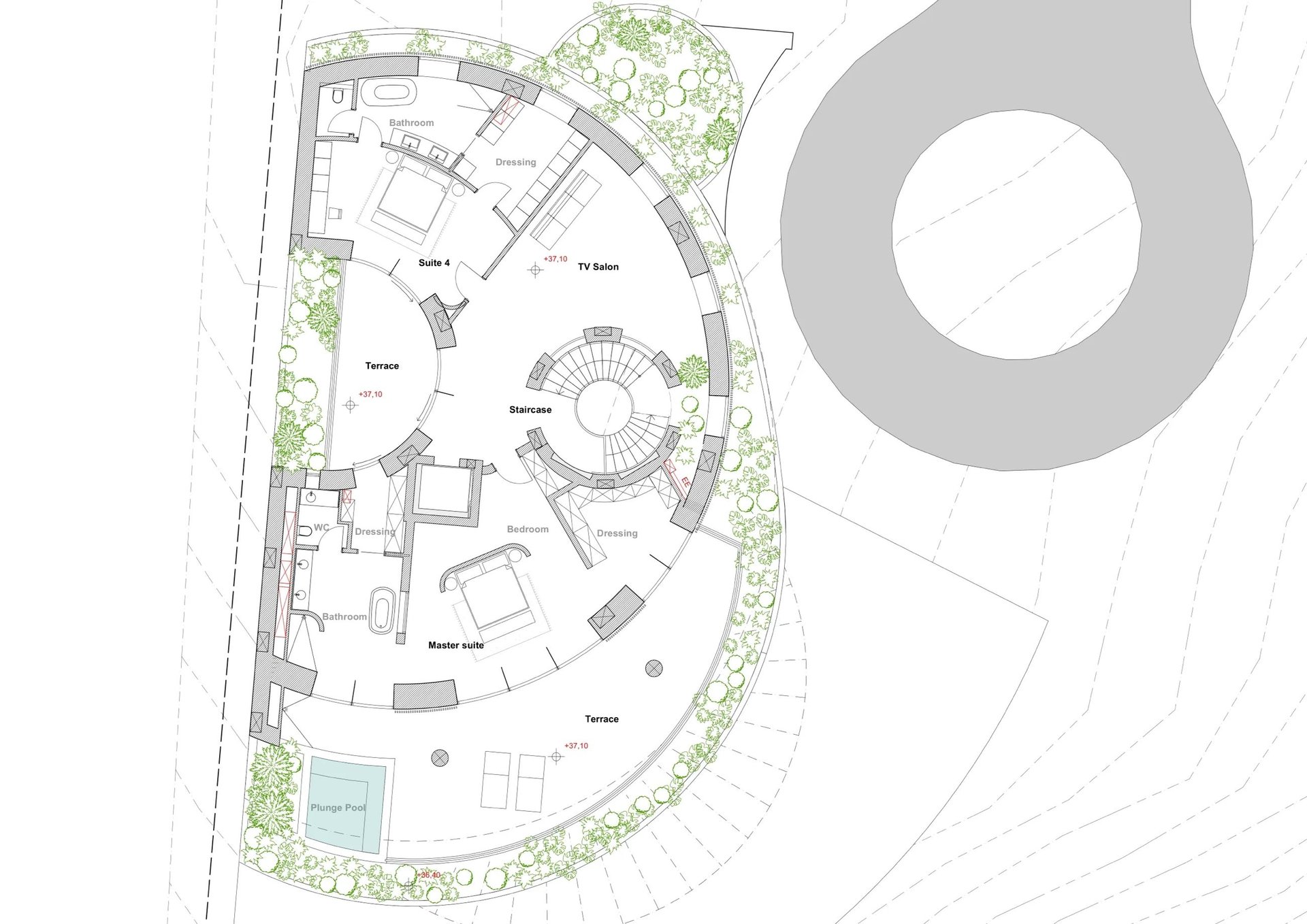 At the summit, Level 3 reveals the master suite, a true sanctuary with dual dressing areas, spa-inspired bathroom, and private TV salon. An additional suite, plunge pool, and terraces create a sky-level escape, where horizon views and architectural clarity inspire stillness and awe.