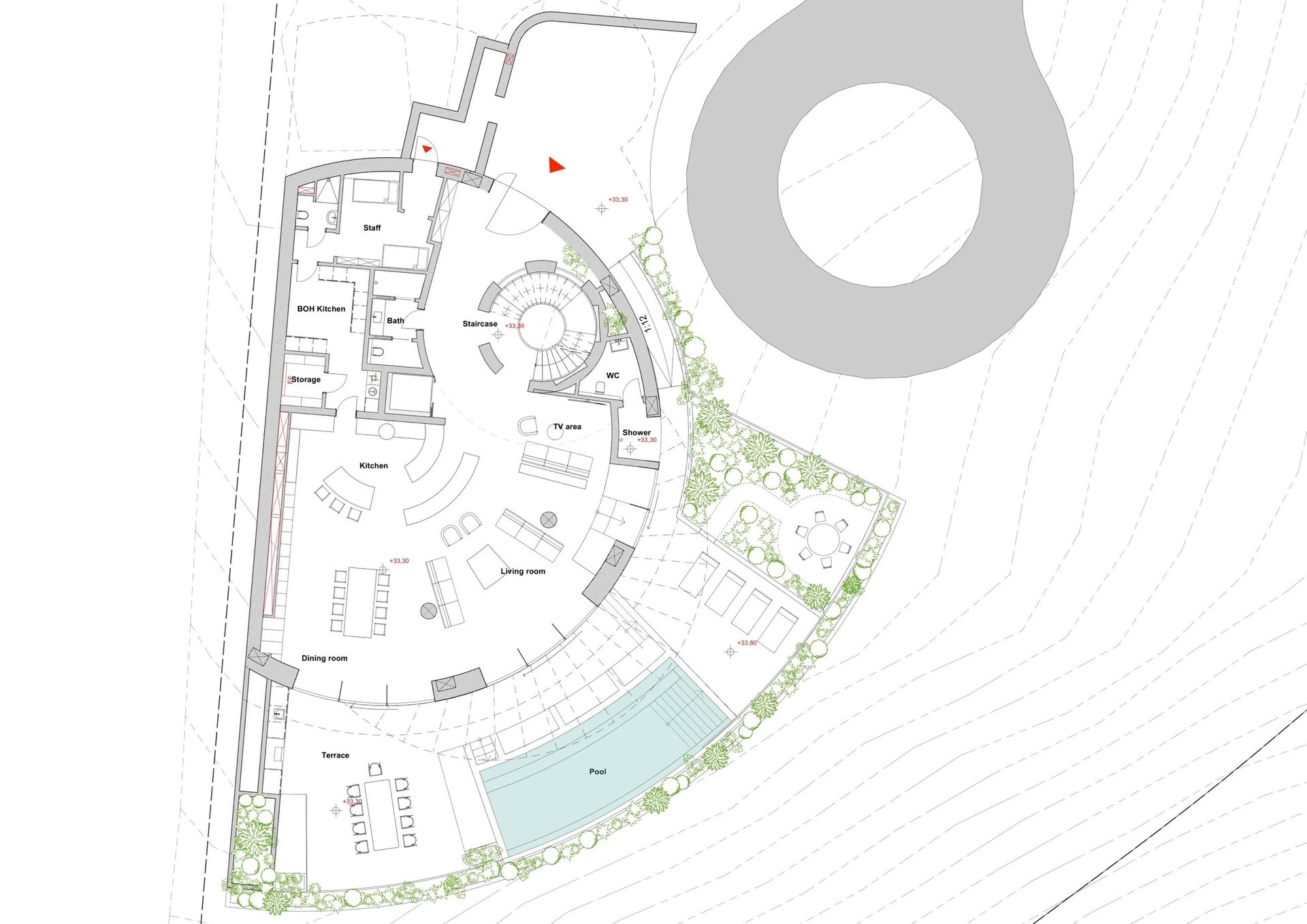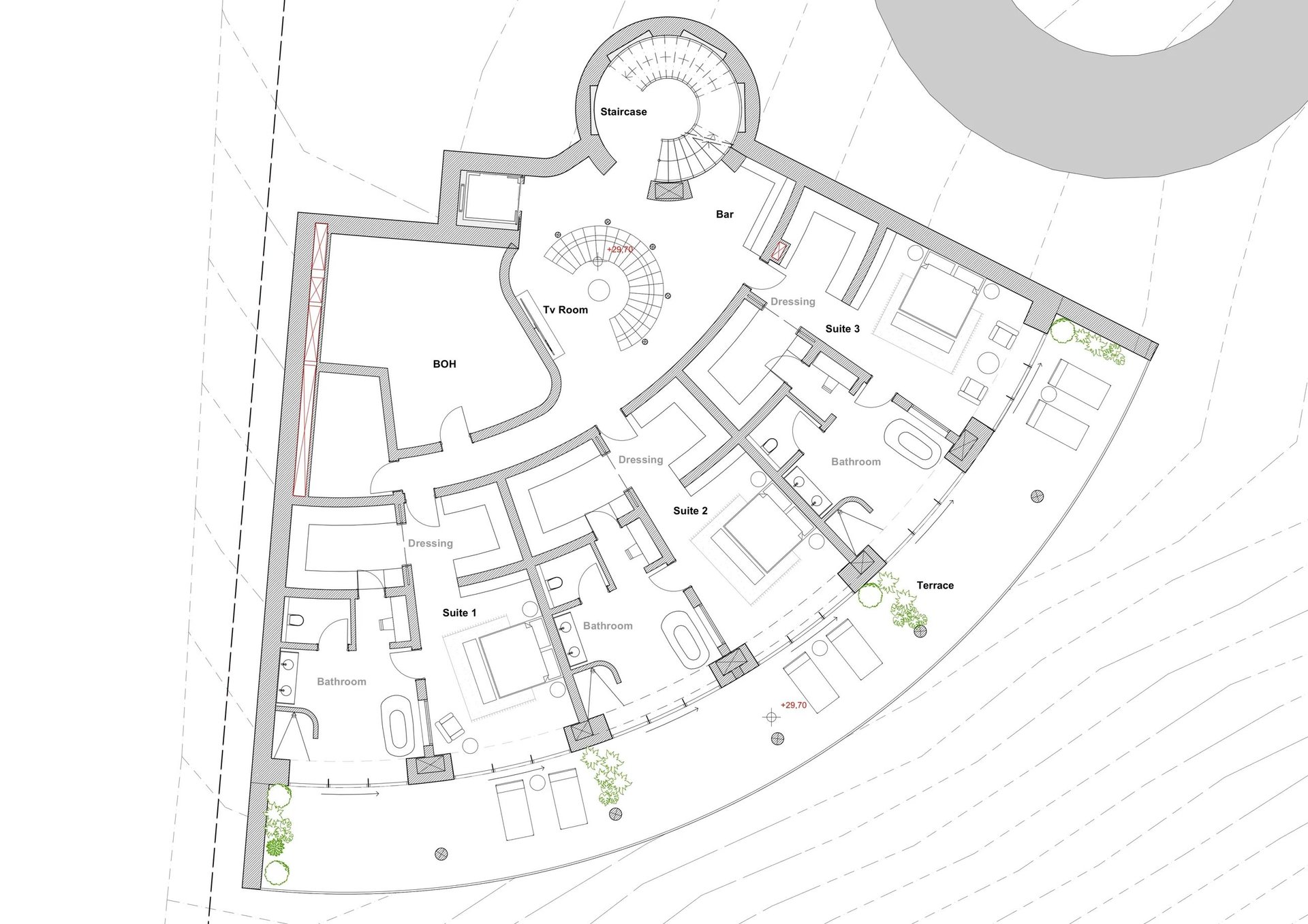 Level 1 presents a welcoming retreat anchored by three thoughtfully designed guest suites, each with en-suite bathrooms and dressing areas. A TV room, bar, and expansive terrace offer spaces for both solitude and connection. With a dedicated back-of-house area and well-considered circulation, this level exemplifies functional elegance and peaceful seclusion.